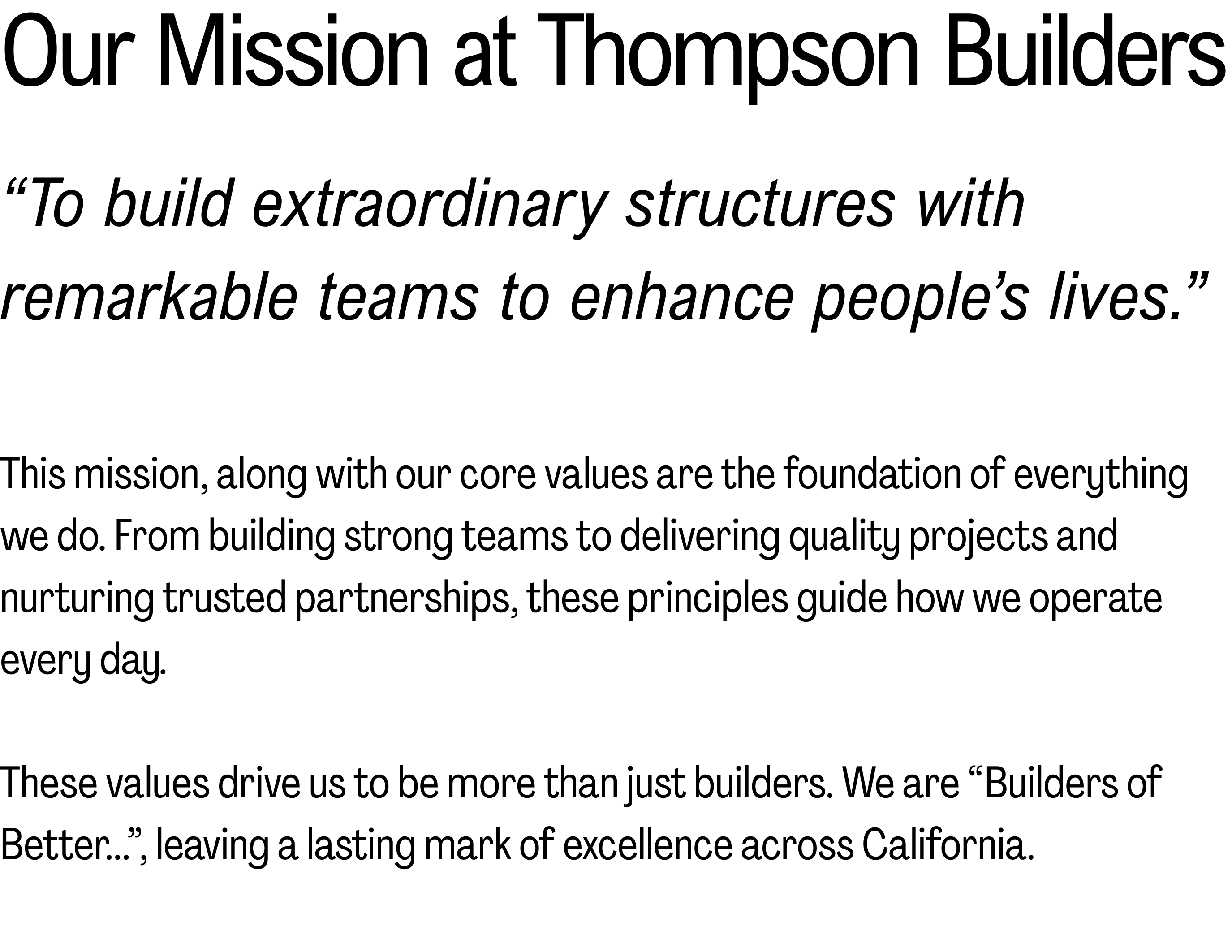 Working in collaboration with project owners, suppliers, subcontractors, and other stakeholders, the Thompson Builders team leverages the diverse skills of our collective team to design, plan, build and deliver large-scale commercial and civil works projects at the highest possible level of quality. Serving California for more than three decades, Thompson Builders has been entrusted with over 200 large-scale commercial projects, a contract value of over $2 billion.